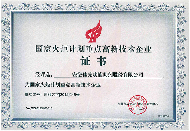 佳先股份国家火炬计划重点高新技术企业